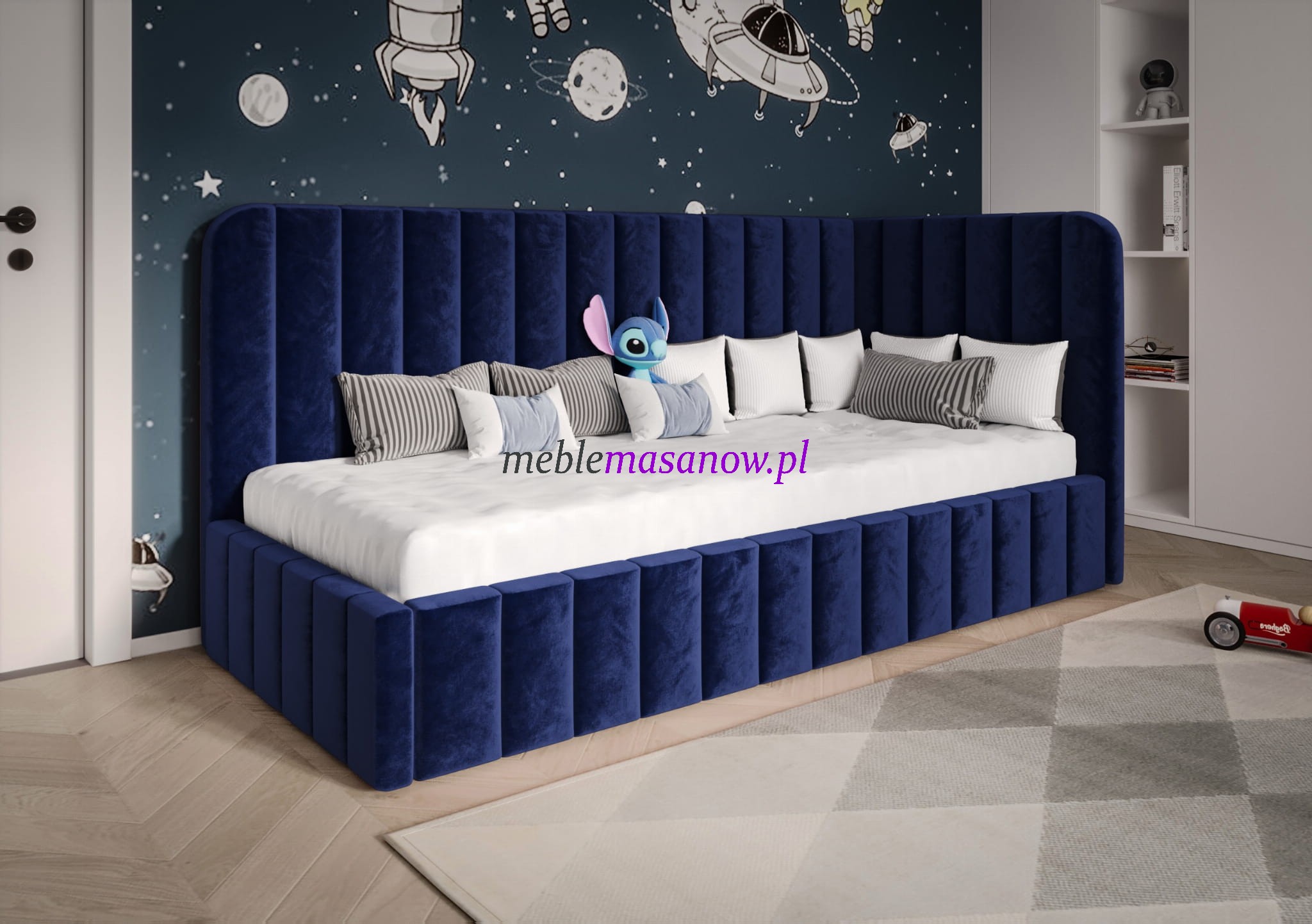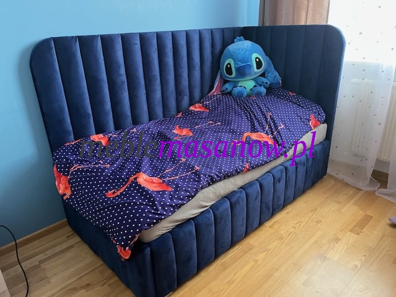 Łóżko Adi to połączenie elegancji, wygody i funkcjonalności. Tapicerowane wysokiej jakości tkaniną welurową w głębokim granatowym kolorze, zachwyca swoją estetyką i przytulnym charakterem. Wysoki zagłówek oraz boczne panele z pionowym pikowaniem nadają mu nowoczesnego wyglądu, a jednocześnie tworzą komfortową strefę do odpoczynku, czytania czy zabawy.