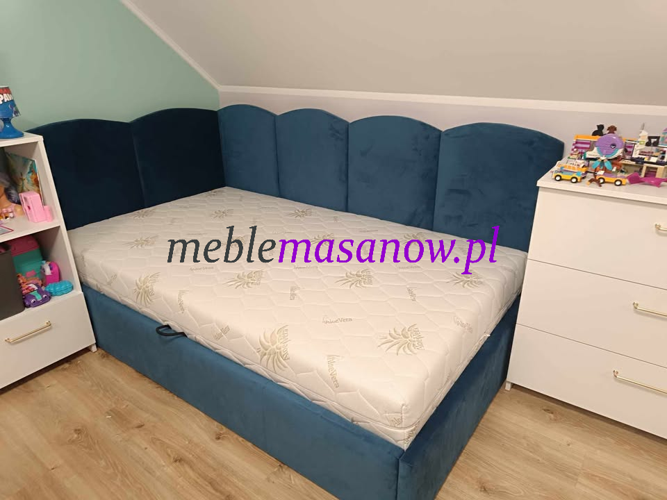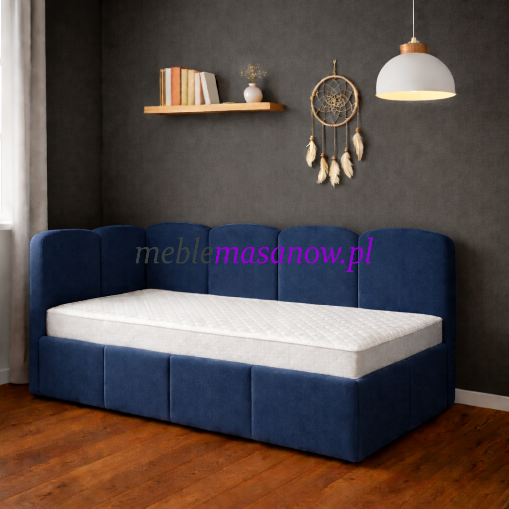 Łóżko Adam to połączenie elegancji, wygody i funkcjonalności. Tapicerowane wysokiej jakości tkaniną welurową w głębokim granatowym kolorze, zachwyca swoją estetyką i przytulnym charakterem. Wysoki zagłówek oraz boczne panele z pionowym pikowaniem nadają mu nowoczesnego wyglądu, a jednocześnie tworzą komfortową strefę do odpoczynku, czytania czy zabawy.