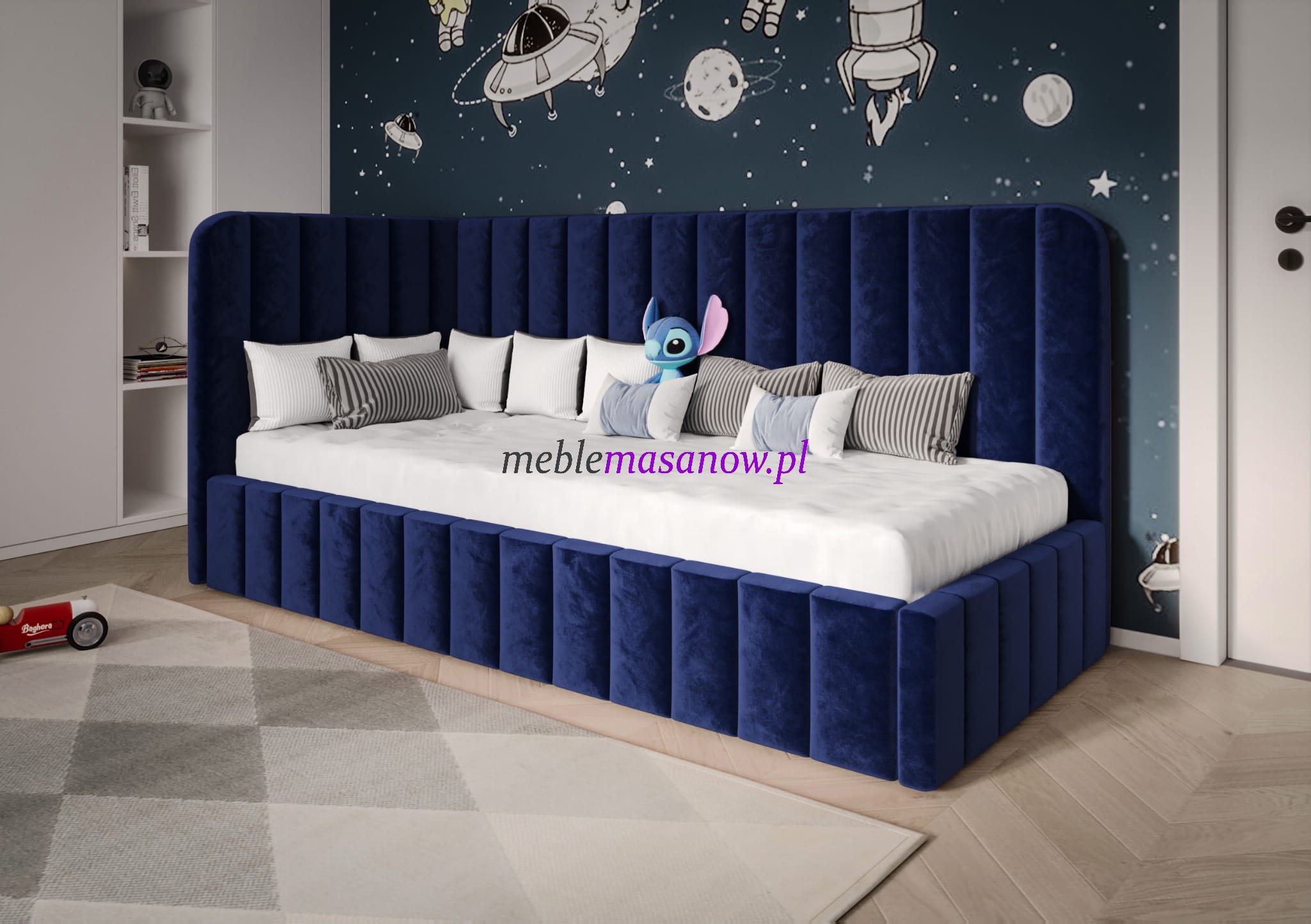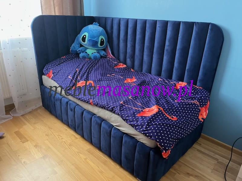 Łóżko Adi to połączenie elegancji, wygody i funkcjonalności. Tapicerowane wysokiej jakości tkaniną welurową w głębokim granatowym kolorze, zachwyca swoją estetyką i przytulnym charakterem. Wysoki zagłówek oraz boczne panele z pionowym pikowaniem nadają mu nowoczesnego wyglądu, a jednocześnie tworzą komfortową strefę do odpoczynku, czytania czy zabawy.