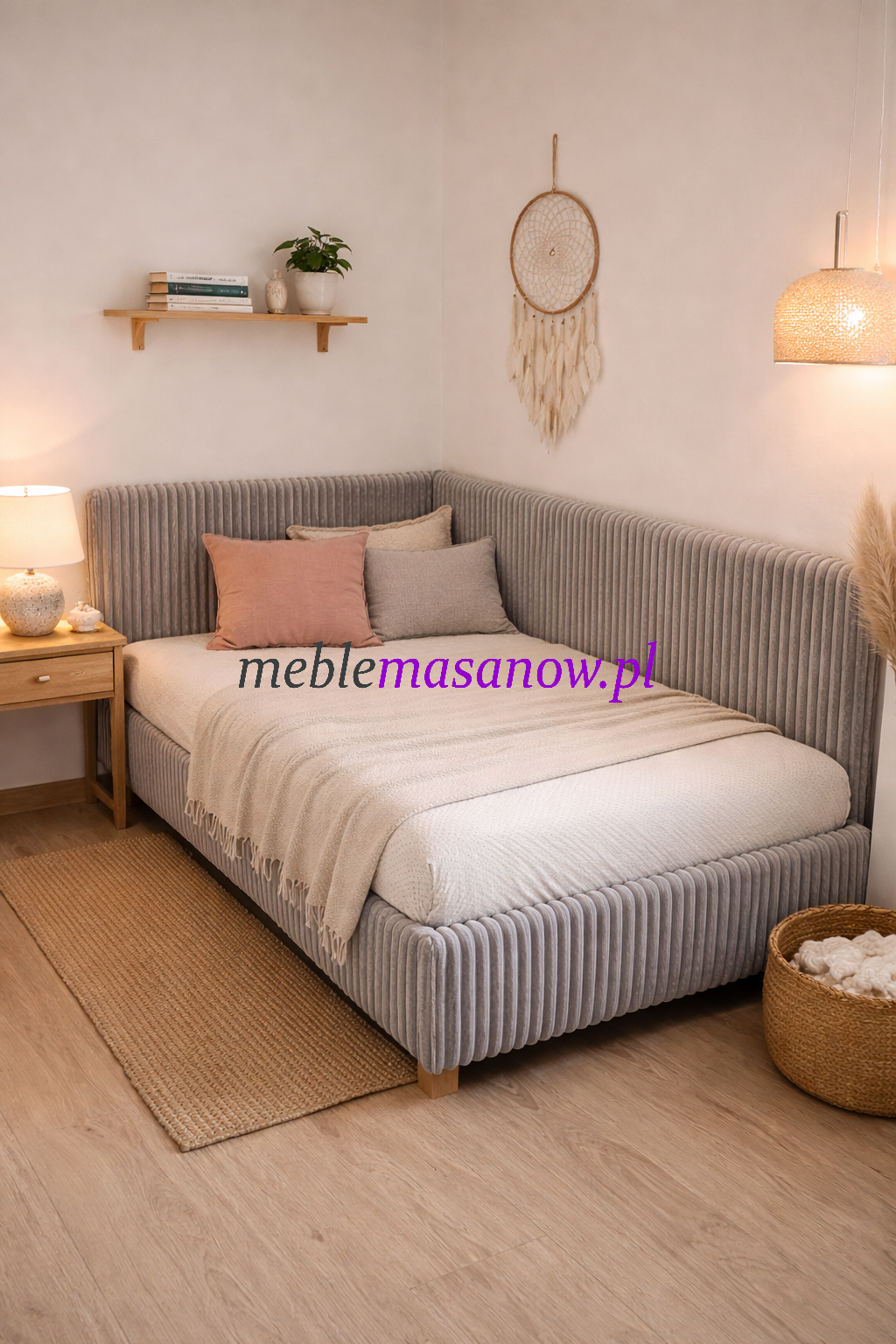 Zabudowana forma z tapicerowanymi bokami oraz zagłówkiem zapewnia komfort podczas codziennego użytkowania – idealnie sprawdzi się zarówno do snu, jak i odpoczynku z książką czy oglądania filmów. Dzięki swojej konstrukcji łóżko Leo świetnie komponuje się także jako praktyczne rozwiązanie do ustawienia w rogu pomieszczenia.